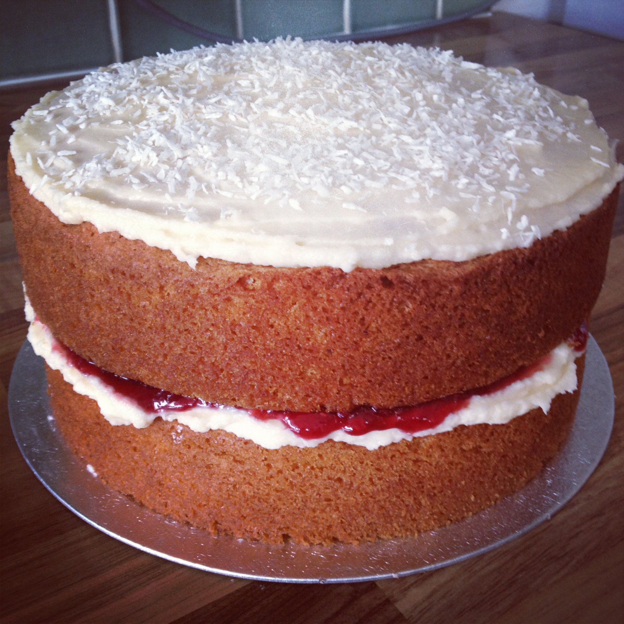 Coconut cake with raspberry jam & coconut buttercream icing.