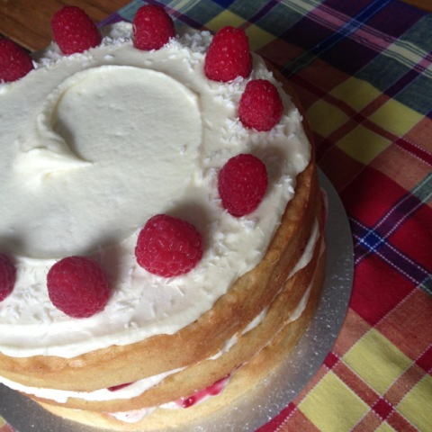 Coconut cake w/ raspberry jam and coconut buttercream icing