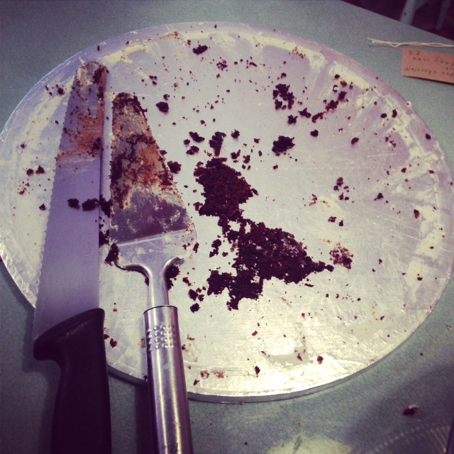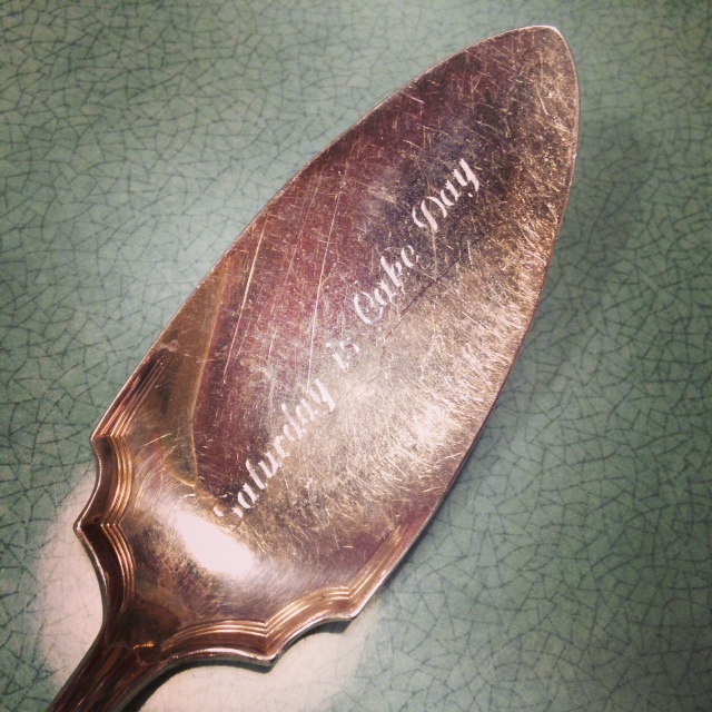 A couple of particularly dedicated cake fiends, Kaylan & Dawn gave us a very touching gift, which finally brought the tear to my eye that I’d held at bay all day. They presented me with a sliver cake slice, which had belonged to Dawn’s Grandmother. They’d had it engraved with ‘Saturday is Cake Day’ a tradition that they withhold stringently every week 🙂