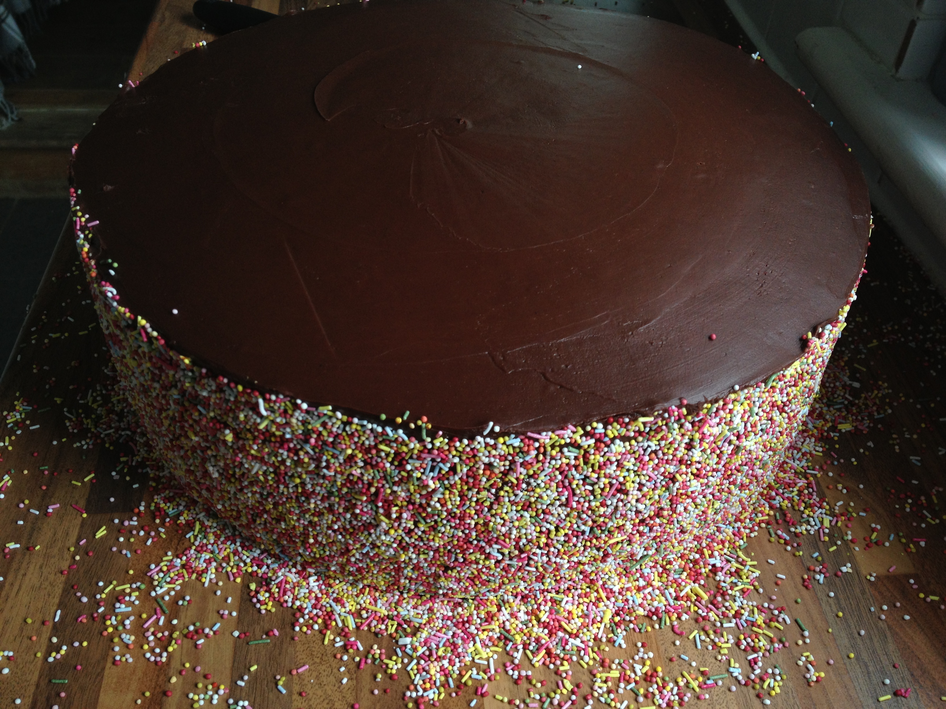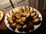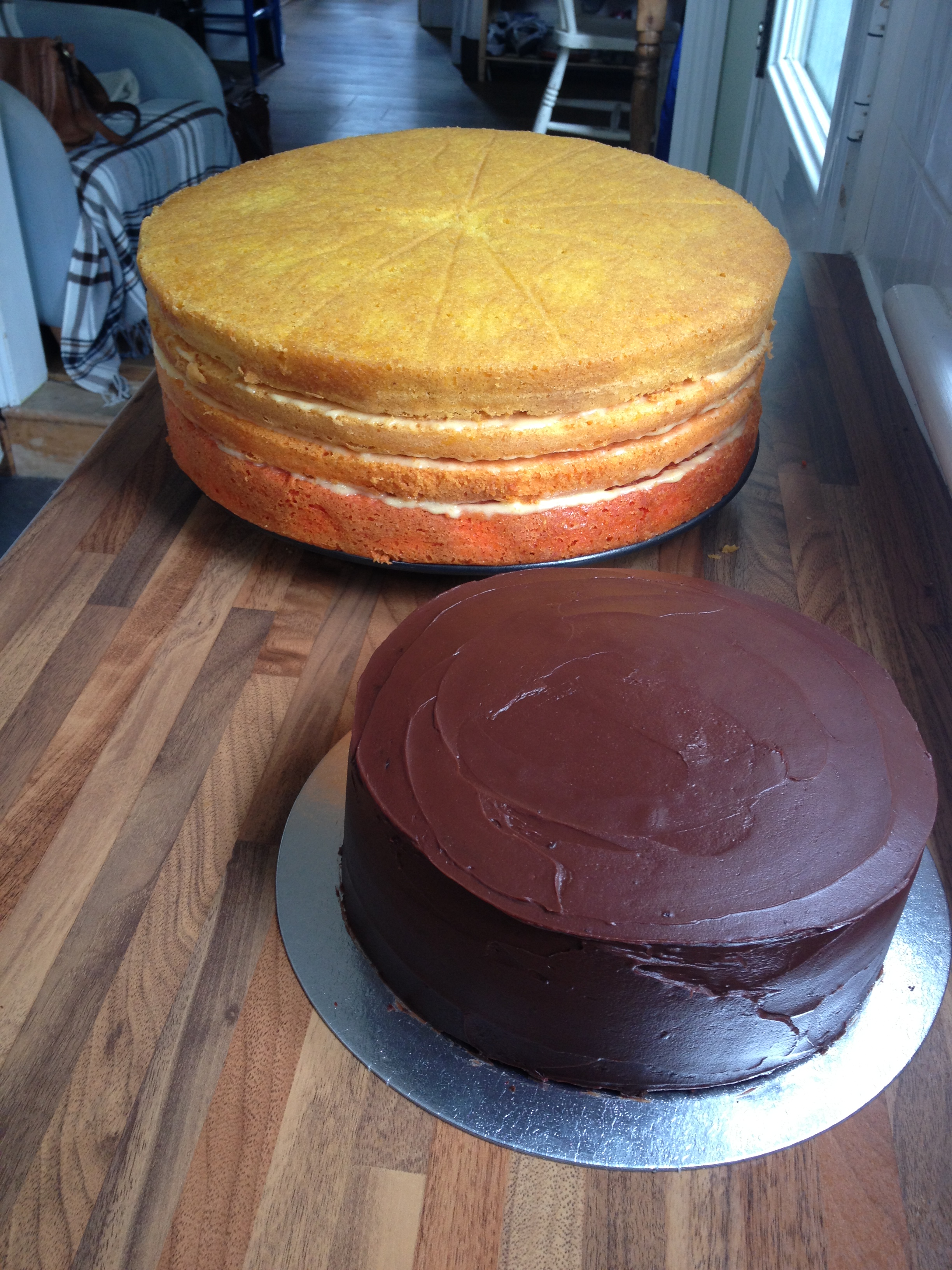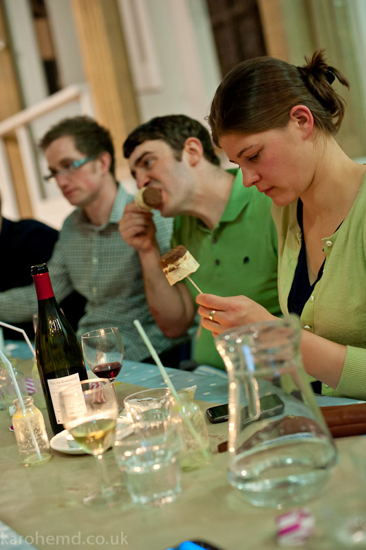 The wine was flowing and waistbands were being loosened as we served up the dessert course…jaffa lamington cakes, our twist on the jaffa cake made by sandwiching my homemade Seville orange marmalade (blogged here) between 2 layers of sponge, dipping it in chocolate sauce and finally coating it in coconut…