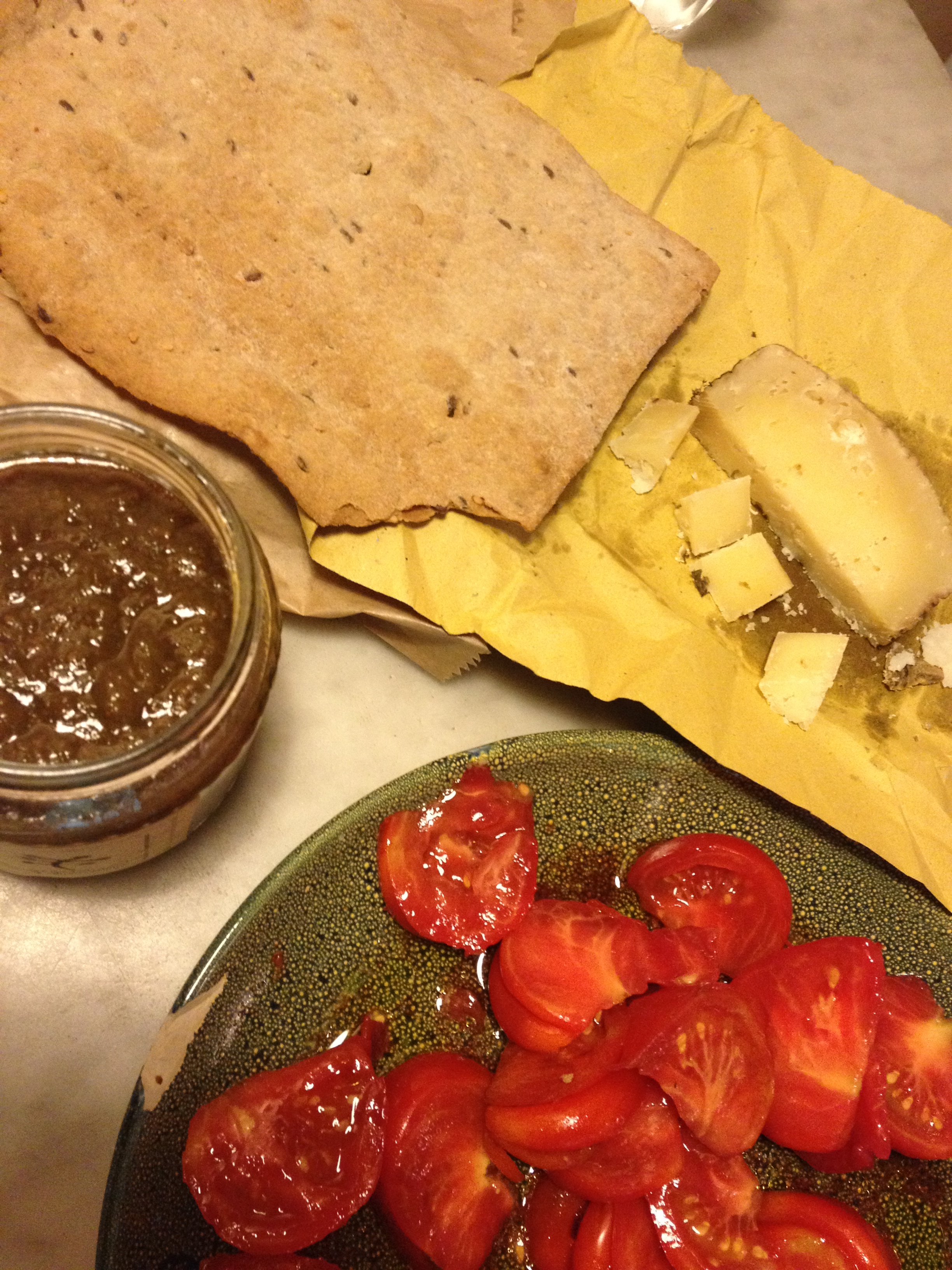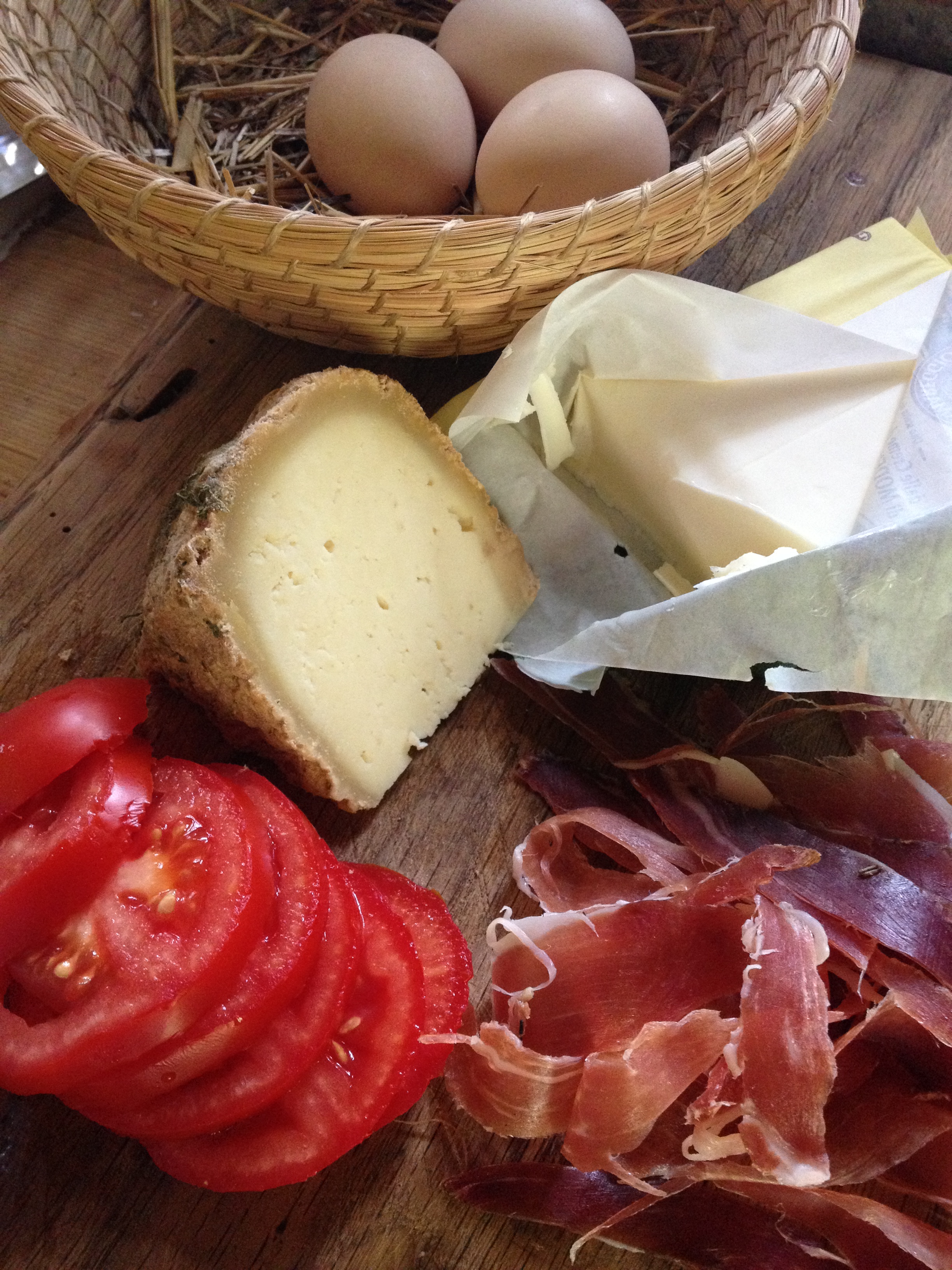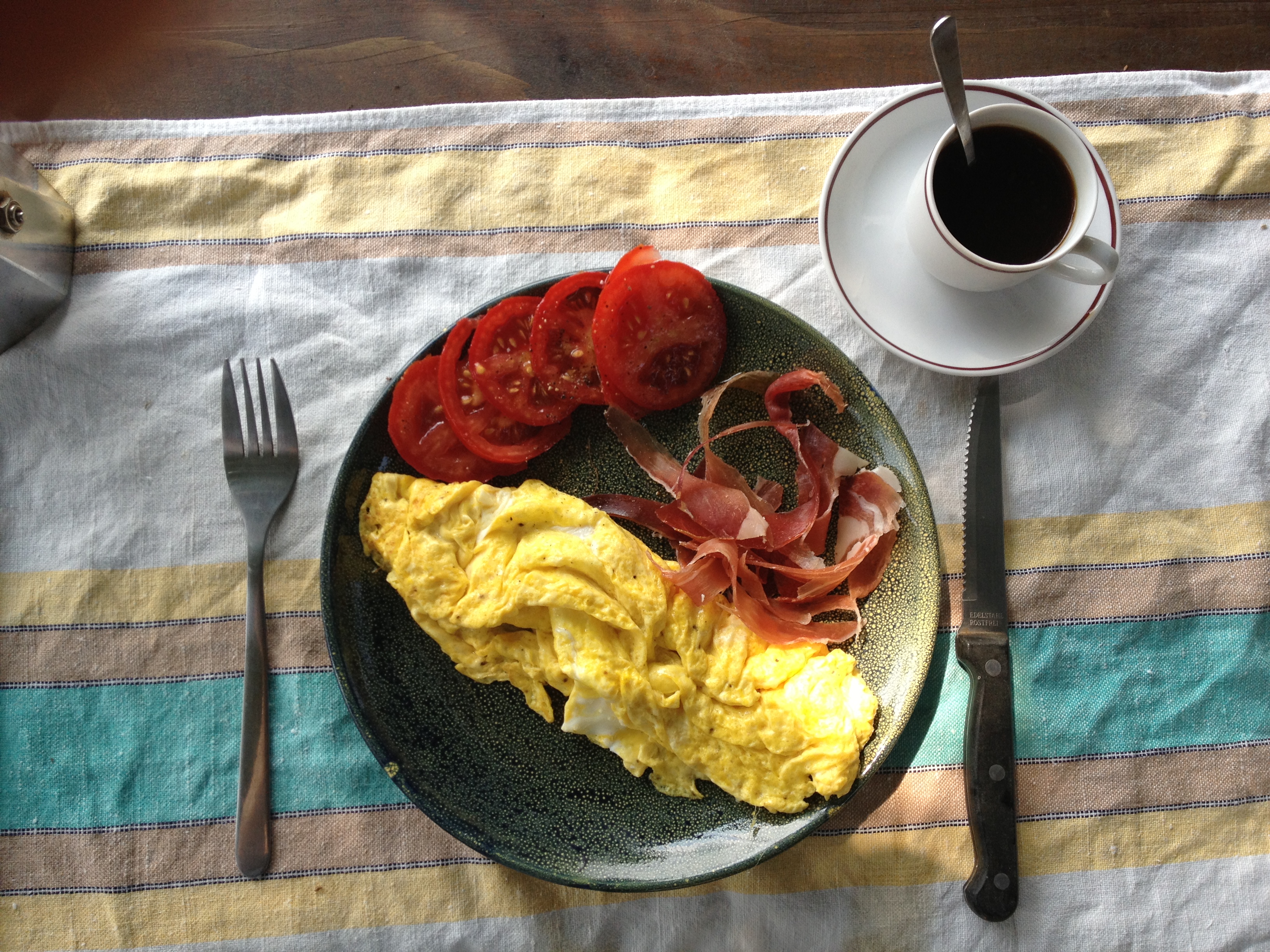 Fresh tomatoes, of the variety that taste sooooo much better than we will EVER get hold of in our own country :), smoked speck, pecorino, creamy butter and our home-layed eggs, whipped up into a delicious omelette…