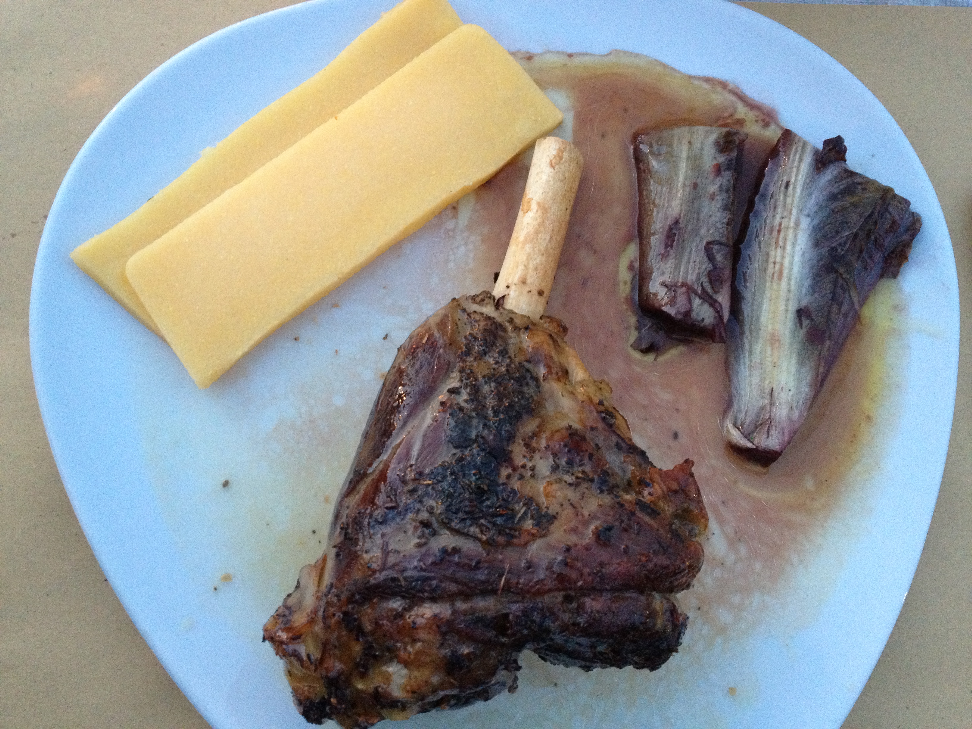 For mains, we’d decided on ‘Lo Stinco d’agnello al forno con polenta e raddichio brasato al vino e miele’ lamb shank with polenta and radicchio cooked in wine and honey…