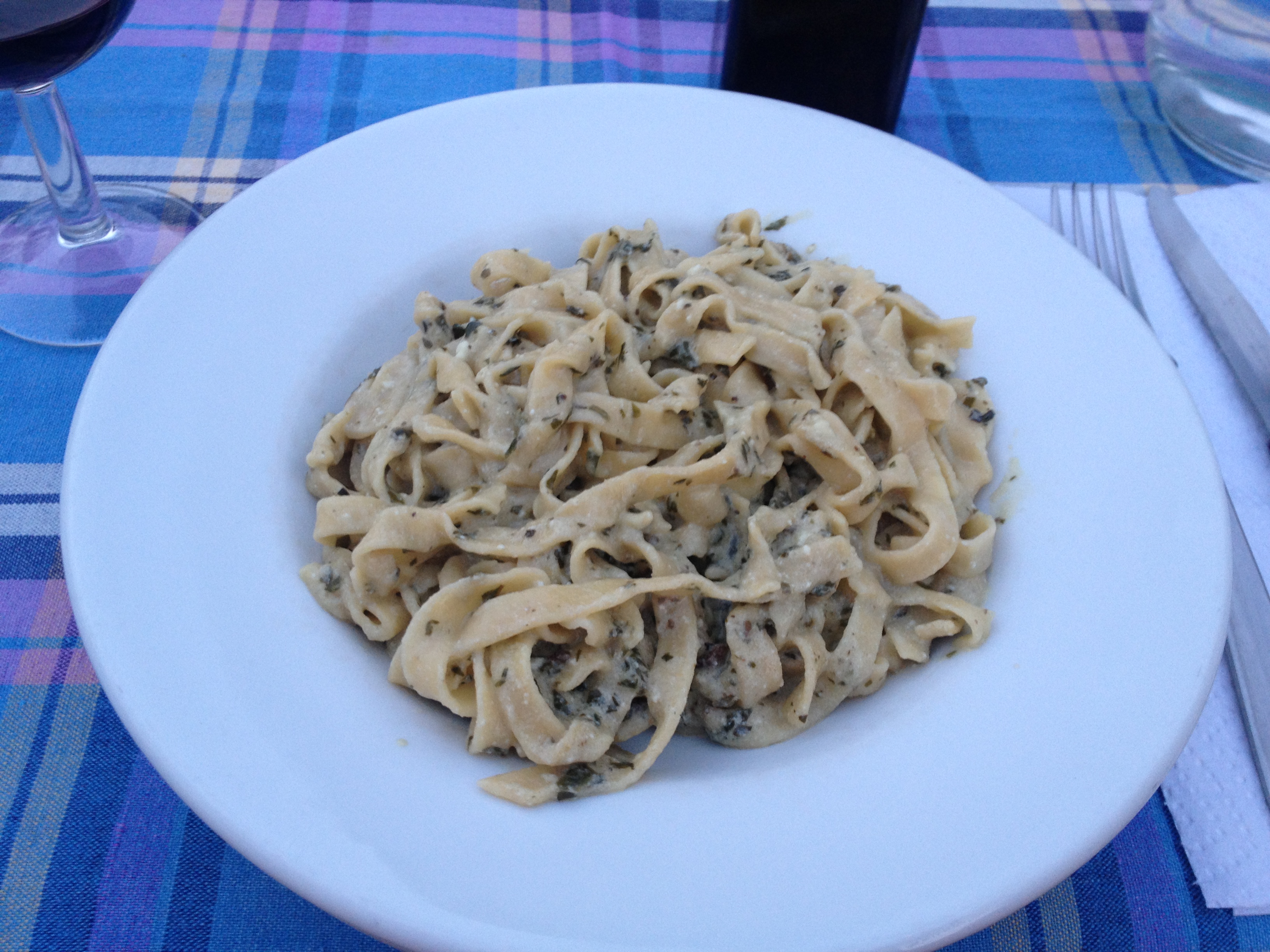 After we’d unpacked and settled in we headed into Citta della Pieve to find our first meal. Francesco and Luisa had drawn us a map and highly recommended that we head for Trattoria Pizzeria Serenella. We located it easily and as we entered the full restaurant, all eyes were on us! It wasn’t a tourist haunt (definitely a good thing) but our obvious foreignness and lack of command of the Italian language made us stick out like a sore thumb! (which is why I didn’t take any photos) 🙂 We persevered and were found a seat and read the menu at lightning speed. Ivana had heard about Pici, a local hand rolled pasta that looks like fat spaghetti but is 100% better, which we had with a simple but amazingly meaty ragu and a lasagna bianco…the stuff cheese dreams are made of! Serenella is a no frills establishment with paper table cloths and abrupt but swift service, the food was delicious and 2 main courses + 2 beers came to 15 Euro!